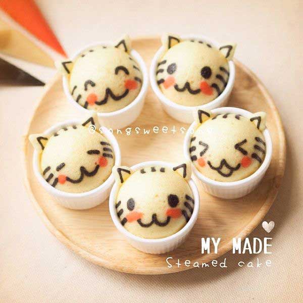 5. ต่อมาบีบส่วนหูค่ะ โดยบีบแป้งบนกระดาษไข นำไปนึ่งประมาณ 3-4 นาที จากนั้นใช้มีดแซะส่วนหูออกมาตกแต่งบนเค้ก พร้อมเสิร์ฟ